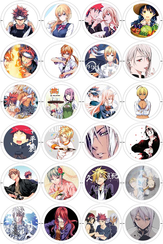 Prendedores de 56mm inspirados en la franquicia "Shokugeki no Soma". Vienen en pack de 24