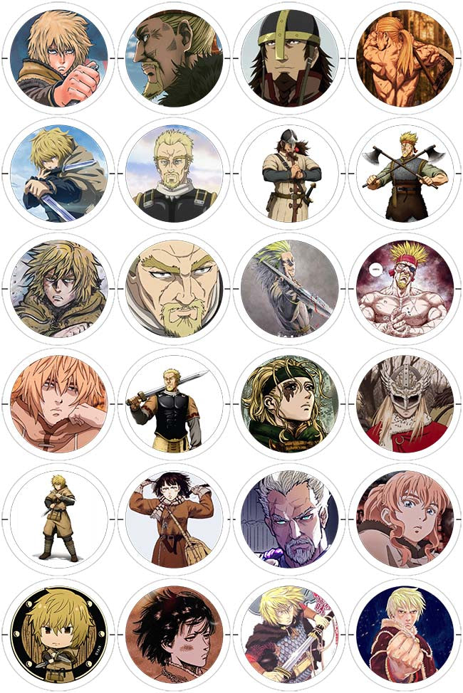 Prendedores de 56mm inspirados en el manga/anime "Vinland Saga". Vienen en pack de 24